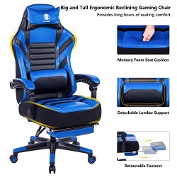 KILLABEE Big and Tall 400lb Memory Foam Reclining Gaming Chair – Adjustable Back Angle and Retractable Footrest Ergonomic High-Back Leather Racing Executive Computer Desk Office Chair, Blue&Black