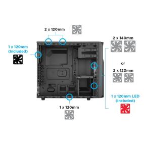 Technical Specifications Tons of fan mounts: Front – 2 x 140/120mm (1 x 120mm LED fan included); Top – 2 x 120mm; Rear – 120mm (fan included); Bottom – 120mm 2 x USB 3.0 front ports with internal connector Large side panel window Cable routing and CPU cooler backplate motherboard cutouts Seven PCIe slots with room for long graphics cards up to 426mm long Install up to three 3.5” and two 2.5” drives simultaneously – tool free Dust filters for front and PSU intake