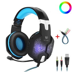 Gaming Headset with Mic for PC,KOTION EACH G1000 One Key Mute Sound Clarity Over-Ear Noise Isolation Gaming Headphones Colors Breathing LED with Volume Control Y Adapter for PS4,Xbox One,Laptop,Blue